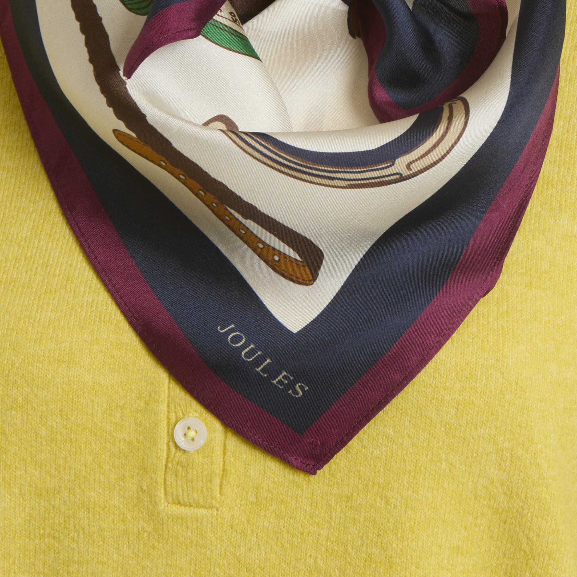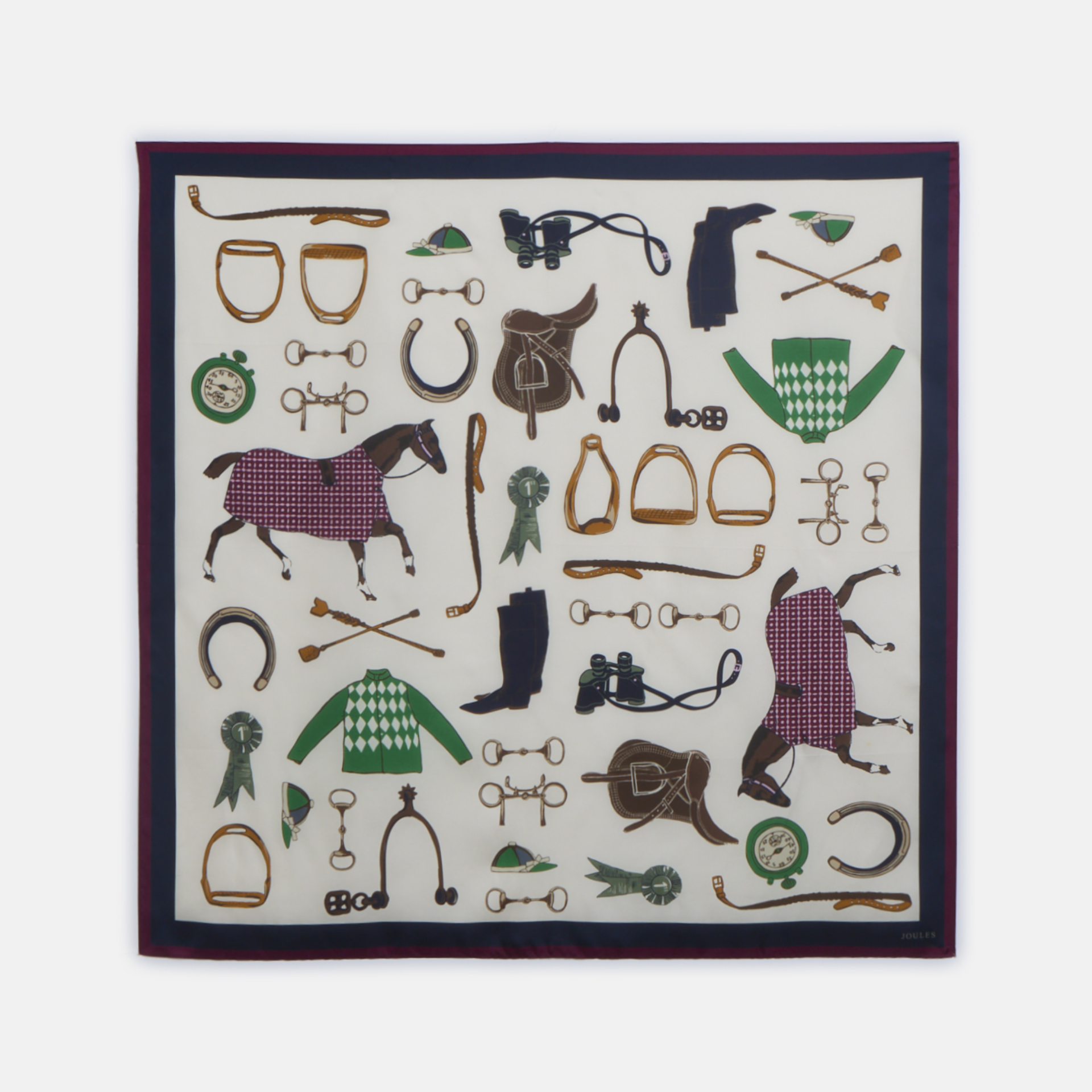 The Joules Elsie Small Square Scarf is a refined accessory, featuring a classic equestrian-inspired design on luxurious silk.