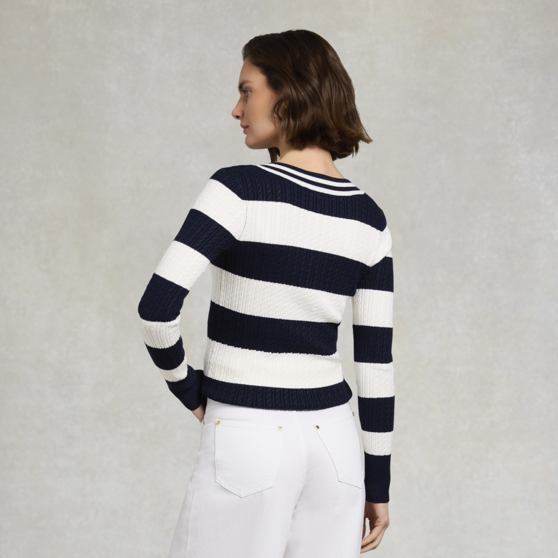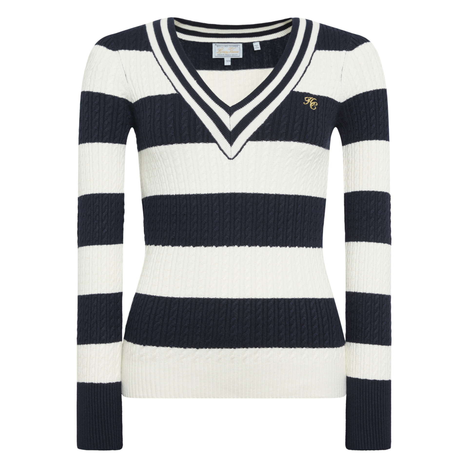 Question(s) answered about Holland Cooper Ladies Badminton Knit - Ink Navy Stripe
