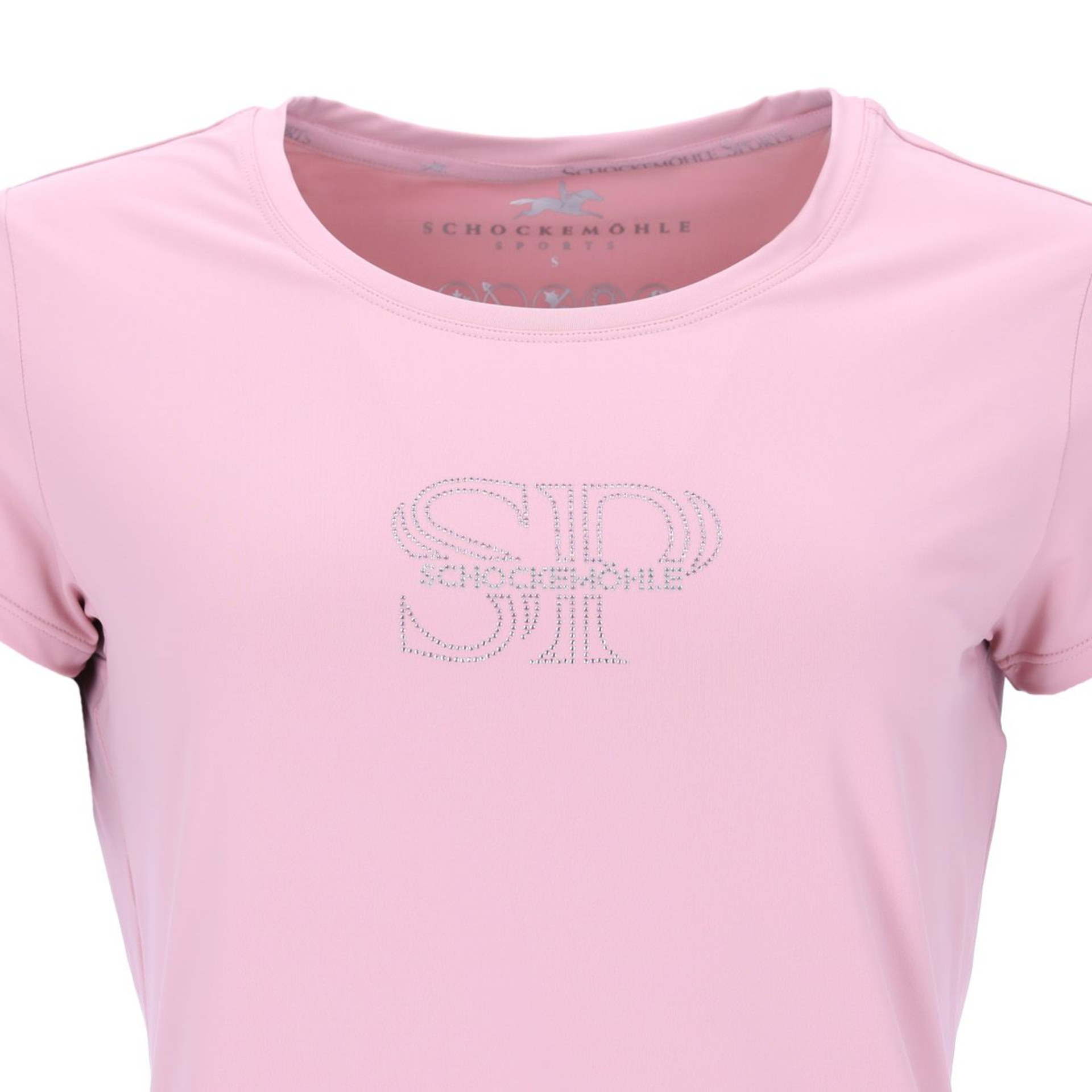The Schockemohle Ladies Nola T-Shirt combines classic style with subtle glamour. Featuring a round neckline and a decorative rhinestone logo motif, it adds elegance to casual outfits. Perforation at the back ensures ventilation, while a flag label on the right sleeve provides a modern, sporty touch.
