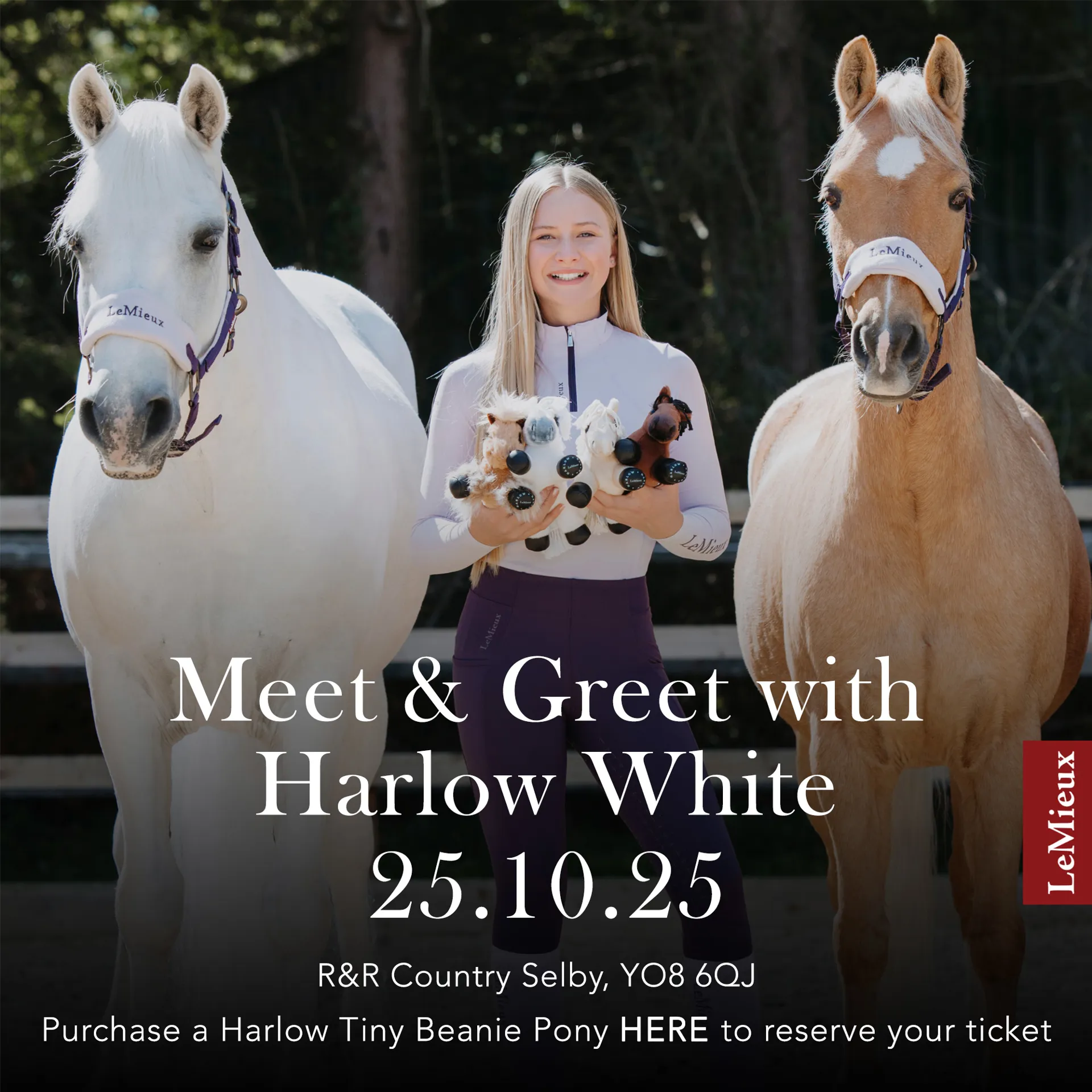 BIG NEWS! Influencer sensation, Harlow White, is coming to R&R Country for the first time. Secure your place today by purchasing the ‘Harlow Meet and Greet’ ticket online and you’ll receive a Harlow Tiny Beanie Pony of your choice PLUS a wristband for one child to meet Harlow in person at our Selby store at 10am on Saturday 25th October 2025.