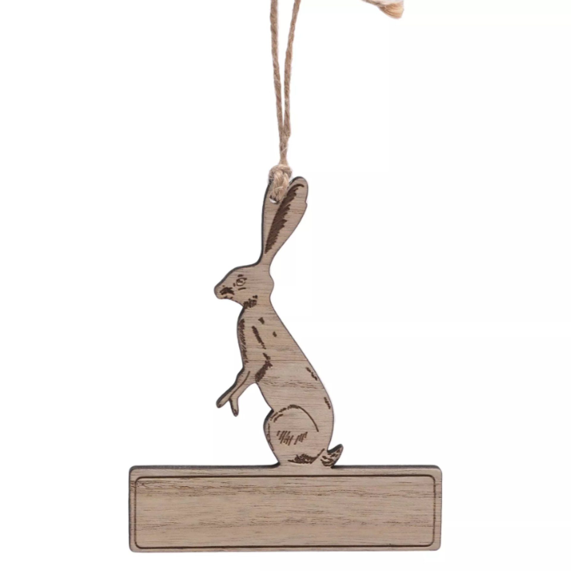 Crafted from wood, the decoration features an engraved hare motif along with a bordered area perfect for personalisation. It is designed to hang beautifully on a Christmas tree using the attached string hanger.