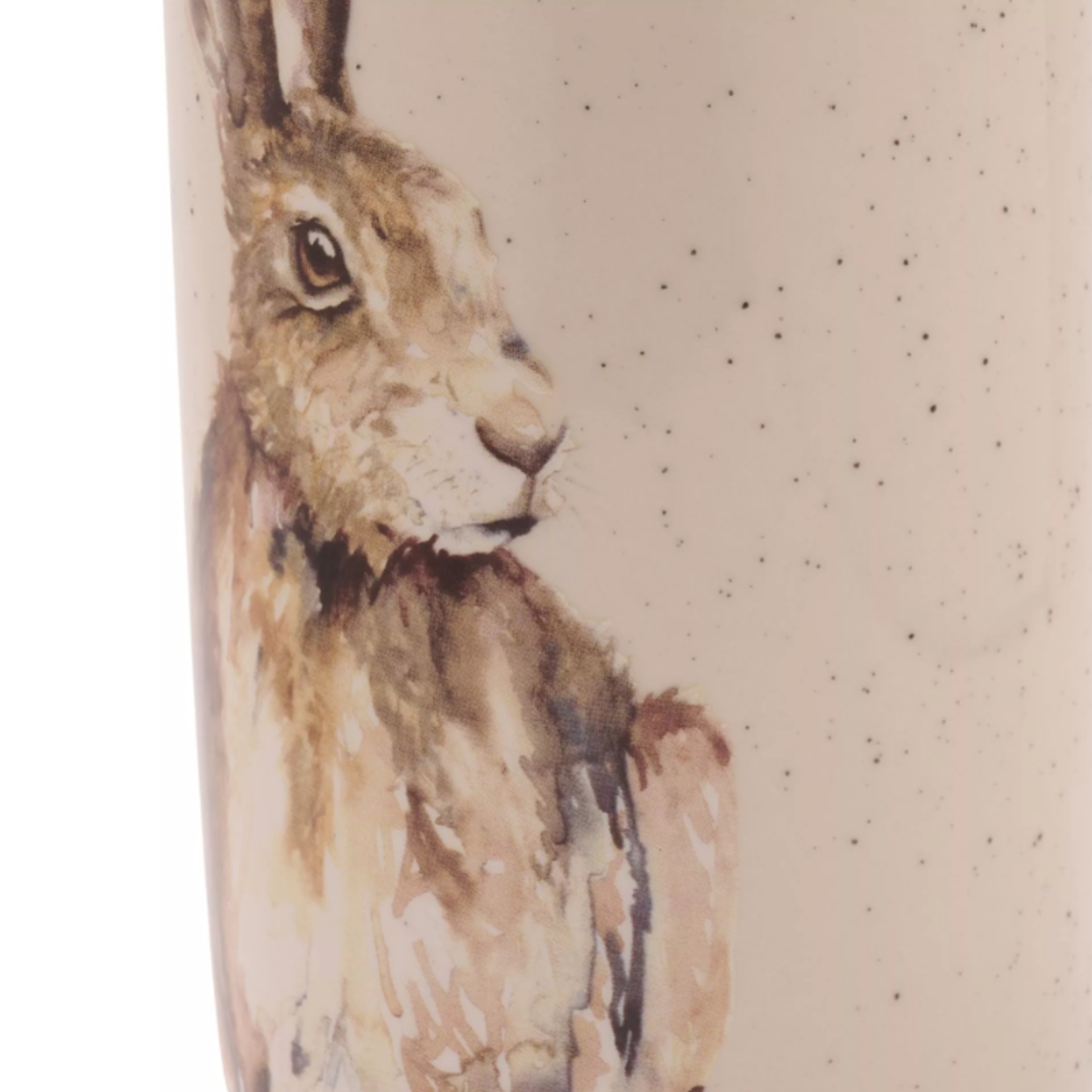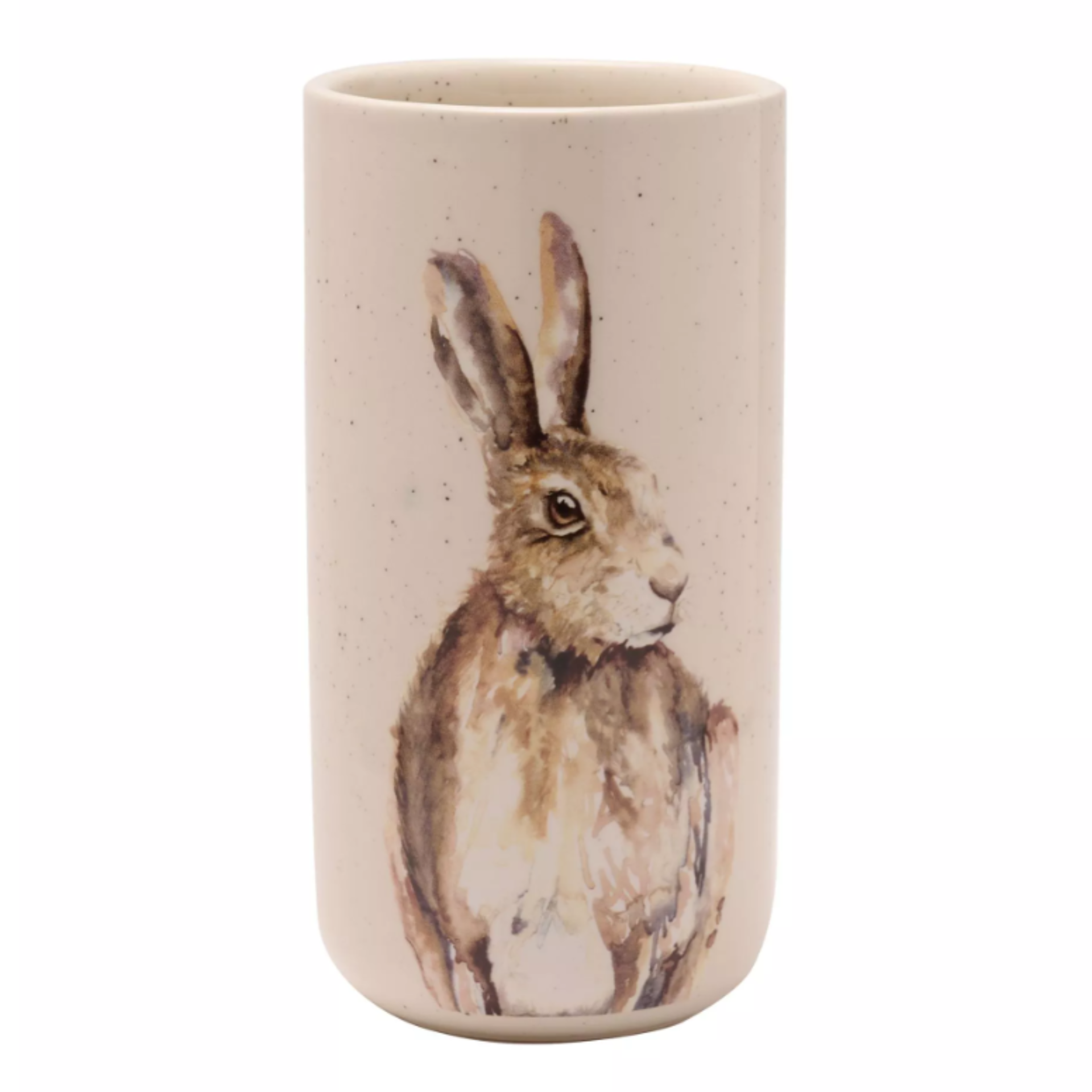 Crafted from white speckled ceramic with a glossy finish, the vase features a beautiful hare illustration by Meg Hawkins. The wide opening allows for generous and attractive flower arrangements.