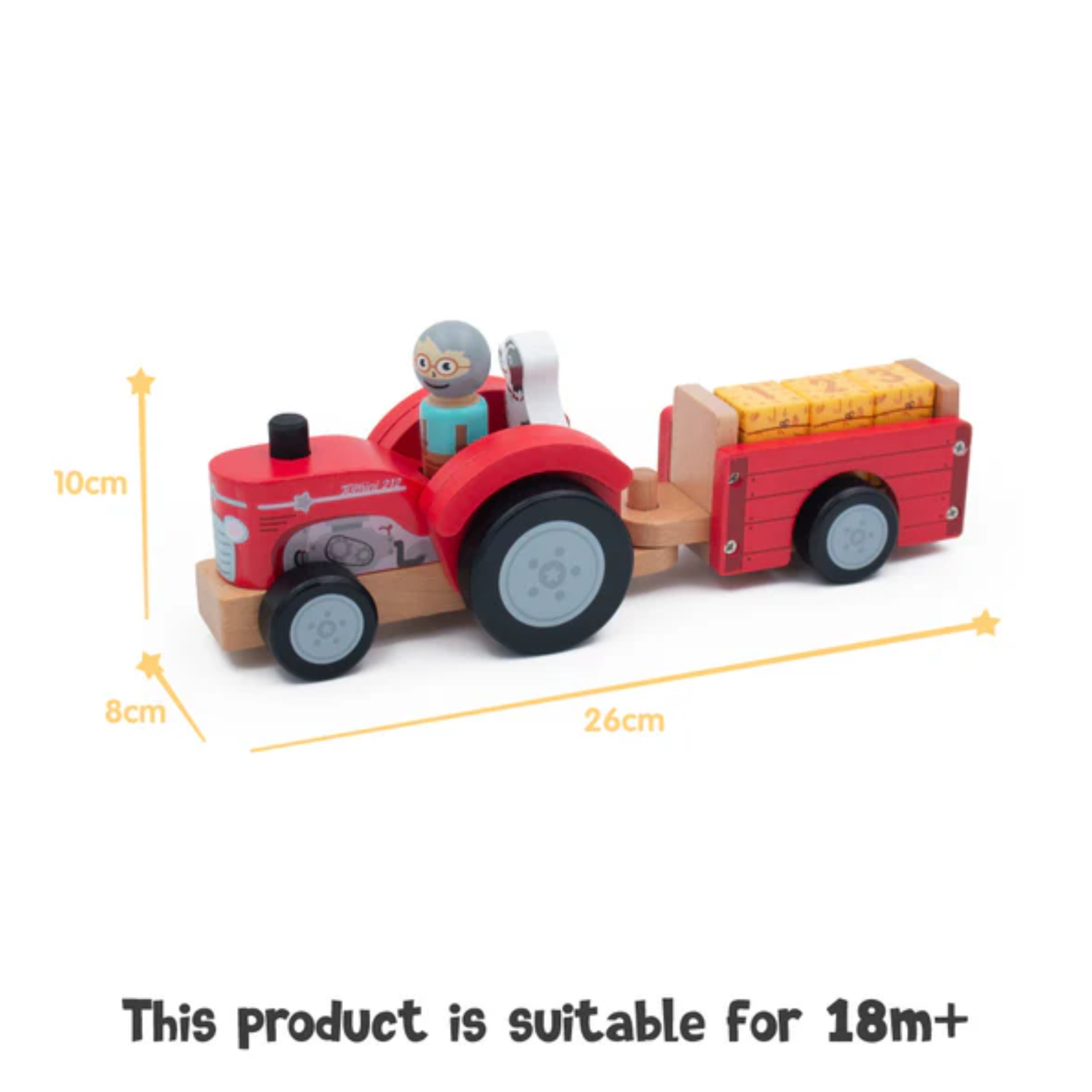 This fun and educational set includes a peg person and their loyal dog, along with 3 hay bales printed with numbers (1, 2, 3) and letters (A, B, C) for added learning and play value.
