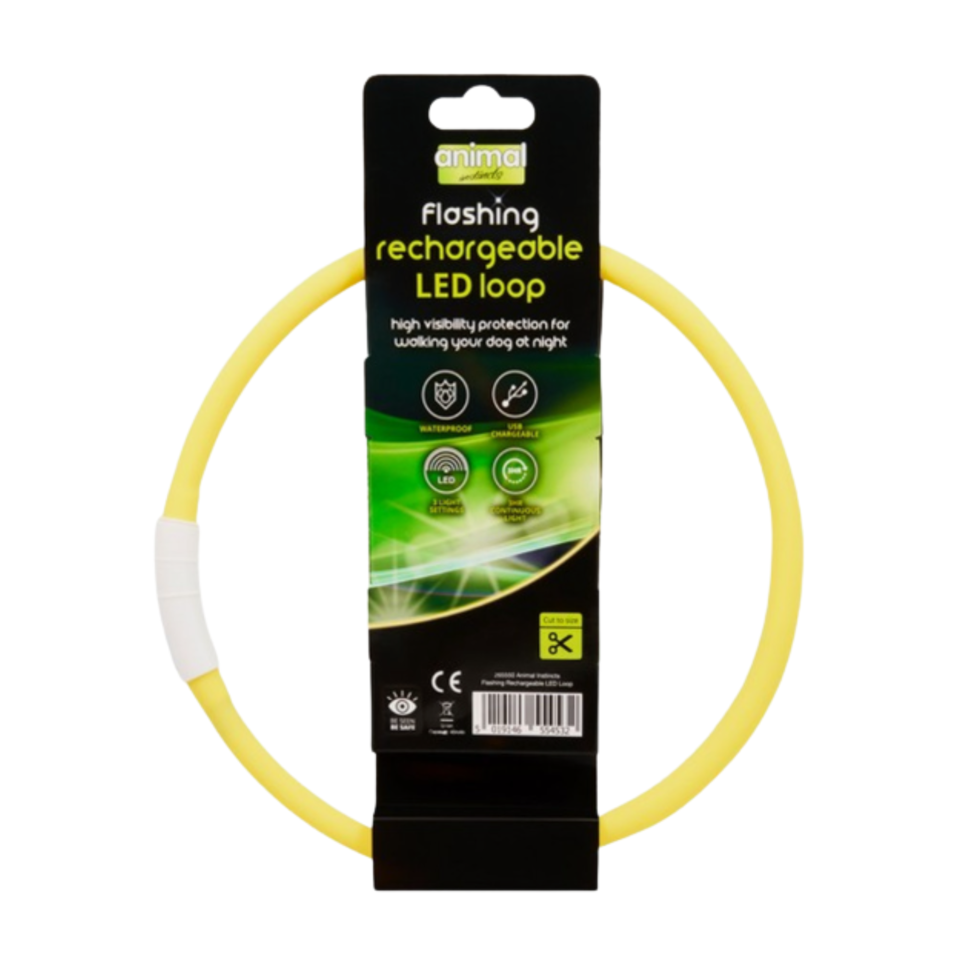 Question(s) asked regarding Animal Instincts Flashing Safety Rechargeable LED 65cm Loop - Yellow
