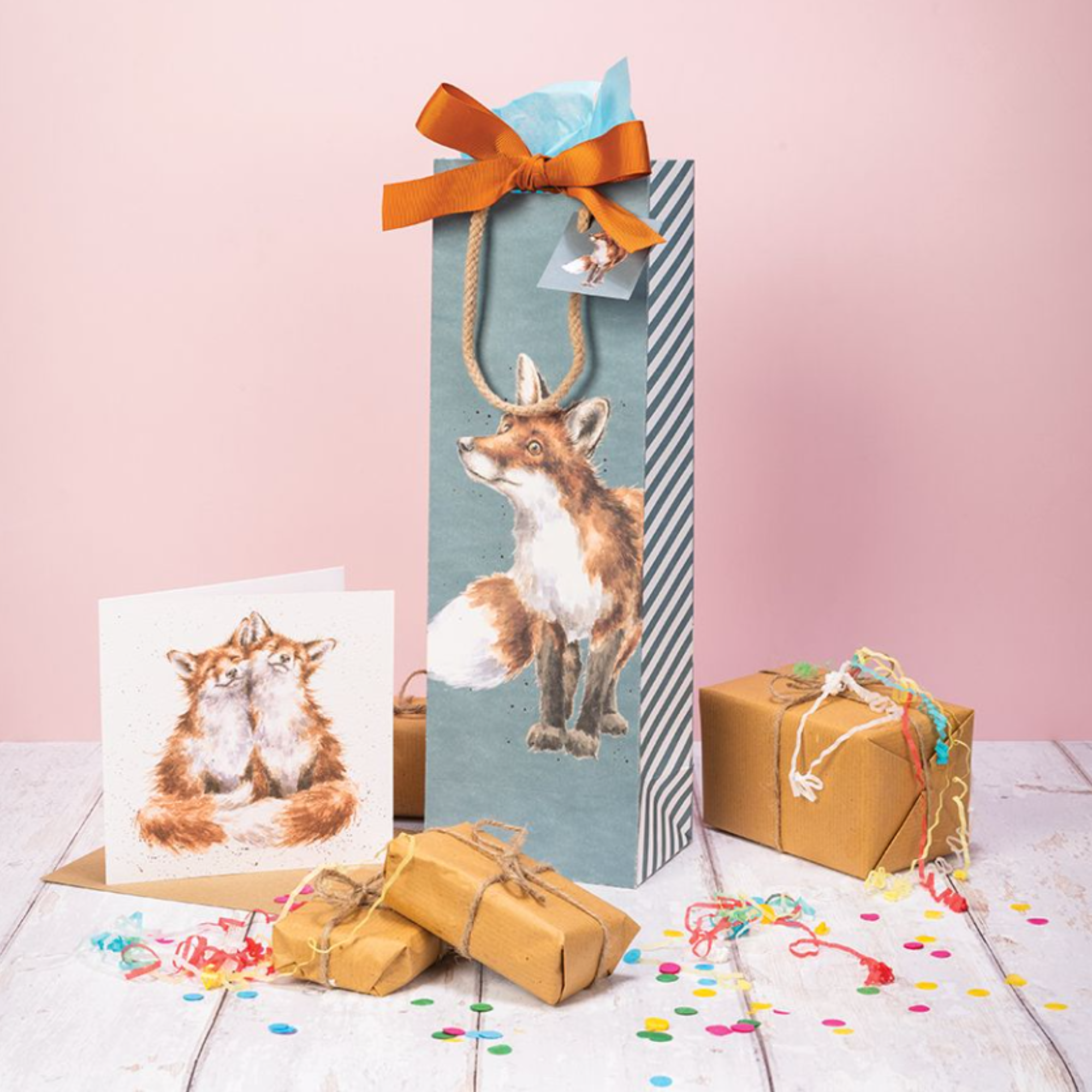 The Wrendale Born to be Wild Bottle Bag is a stylish way to present a bottle gift, featuring a charming fox design on a blue background with an orange ribbon finish.