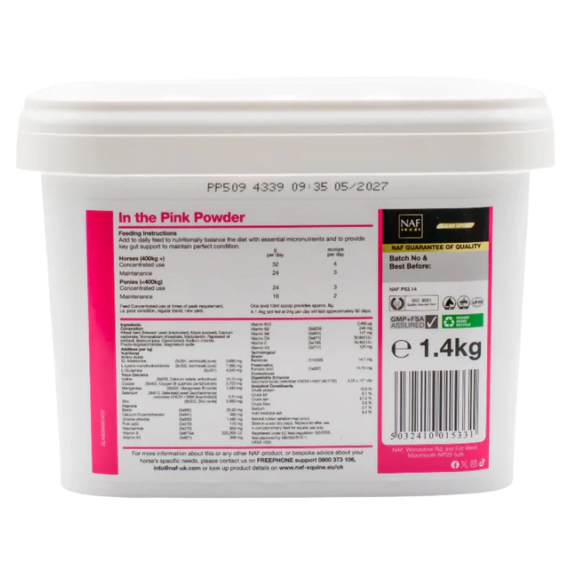 NAF In the Pink Powder is formulated to support the overall wellbeing of every horse from cherished companions to top-level athletes. It delivers beneficial levels of essential vitamins, minerals, and micronutrients to maintain condition, with added gut support to optimise nutrient absorption, promoting a horse that looks great on the outside and feels great on the inside.